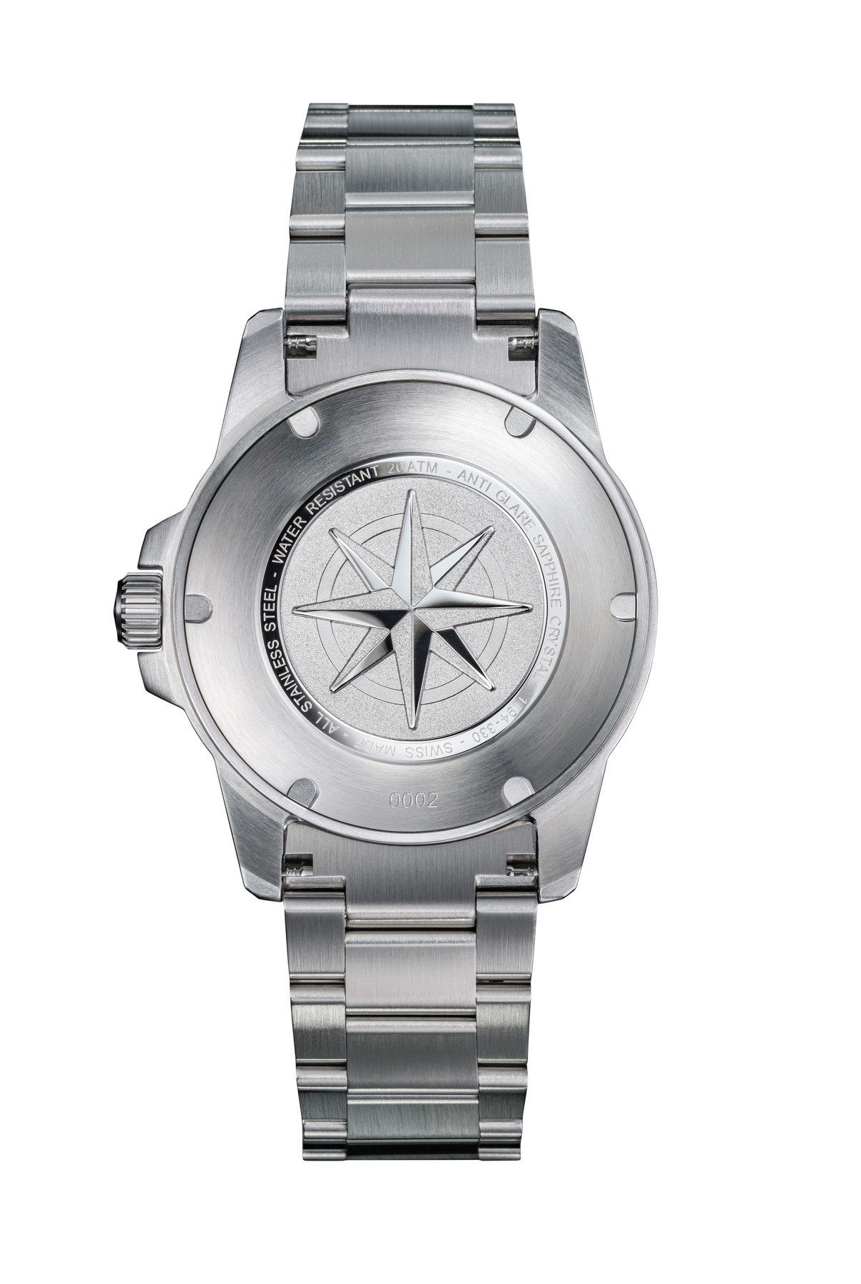 - Der Gehäuseboden ist ein mit Vollgewinde verschraubter Edelstahlboden. Der Edelstahlboden besitzt eine erhabene Relief Windrose.