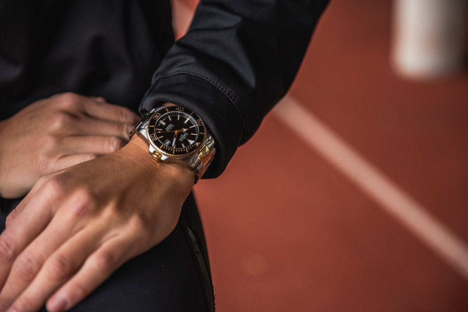 - Einseitig links drehbare, präzise rastende schwarze Keramik Taucherlunette mit 120 er Rastung und weisser Beschriftung. Super-Luminova BGW9 Leuchtmassepunkt auf dem Dreieck / 12:00 Uhr Position.