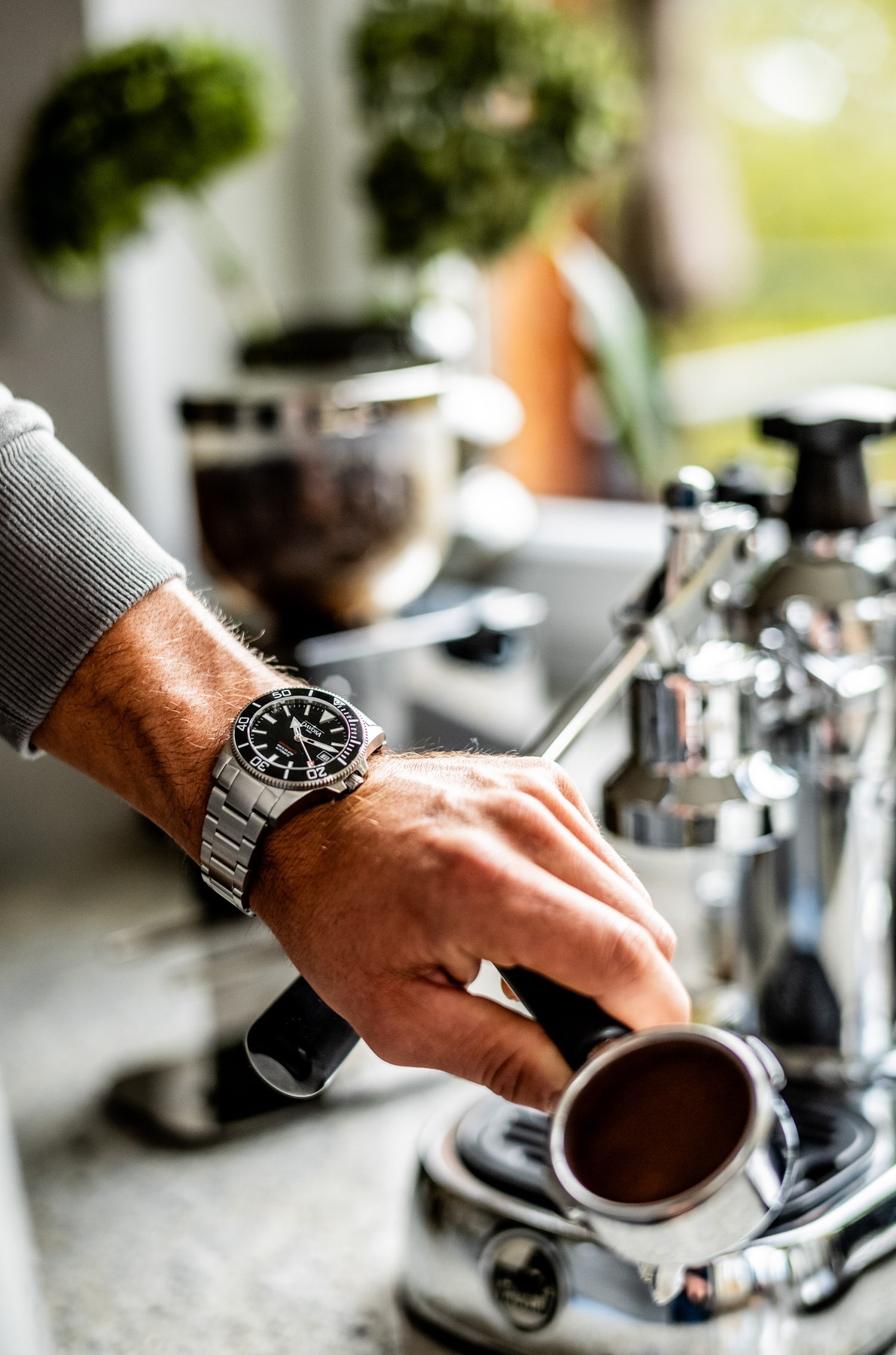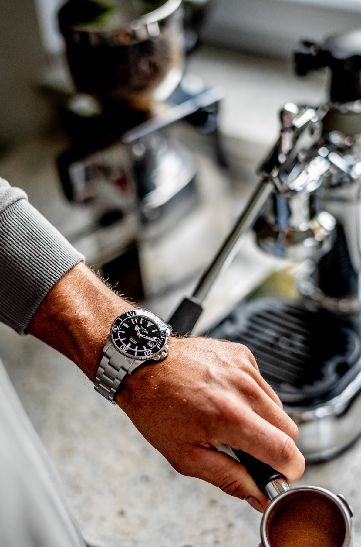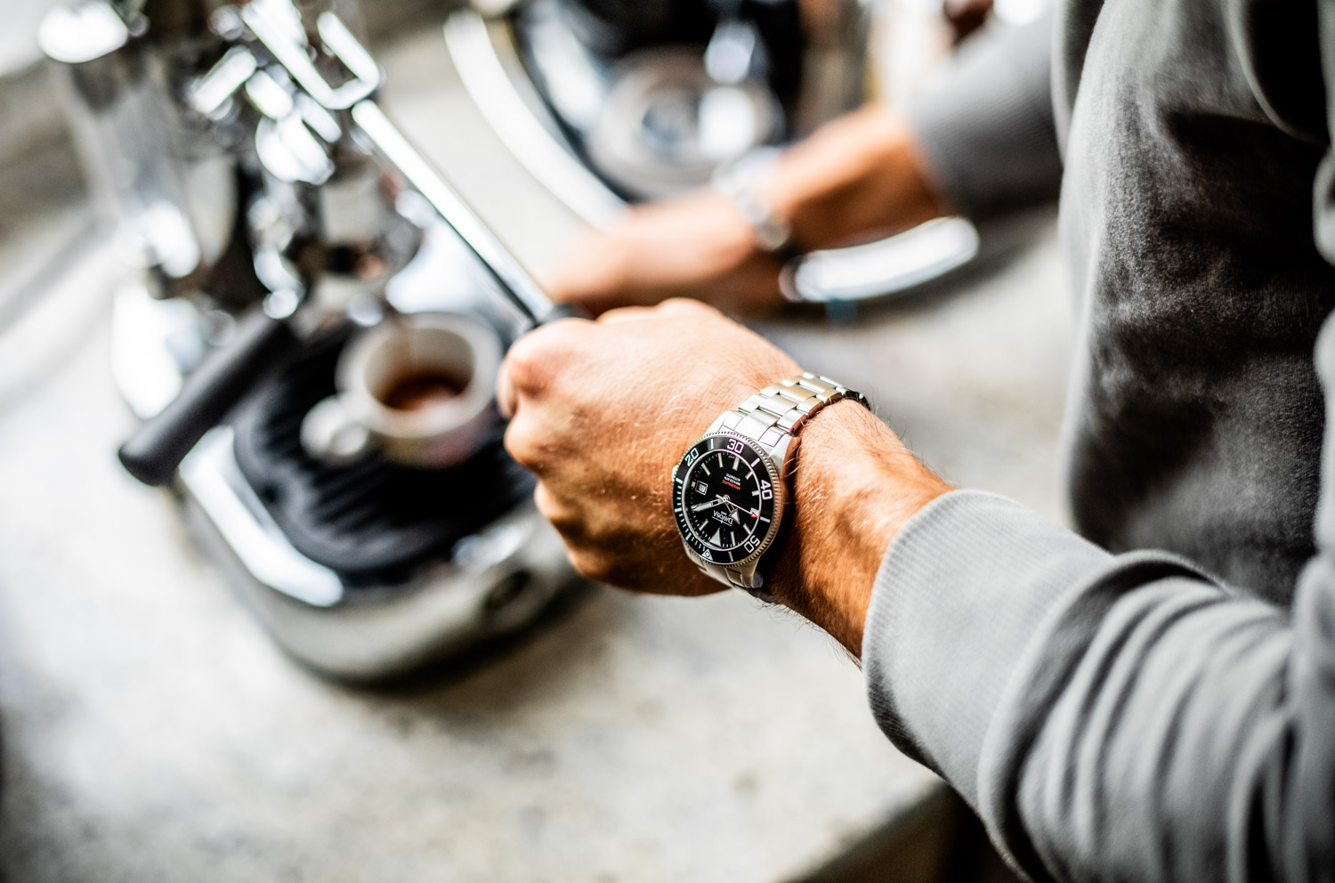 Taucheruhr mit praktischer ausklappbarer Taucherverlängerung an der Edelstahl Faltschliesse. Klassisches Unisexmodell mit moderaten 39 mm Durchmesser.