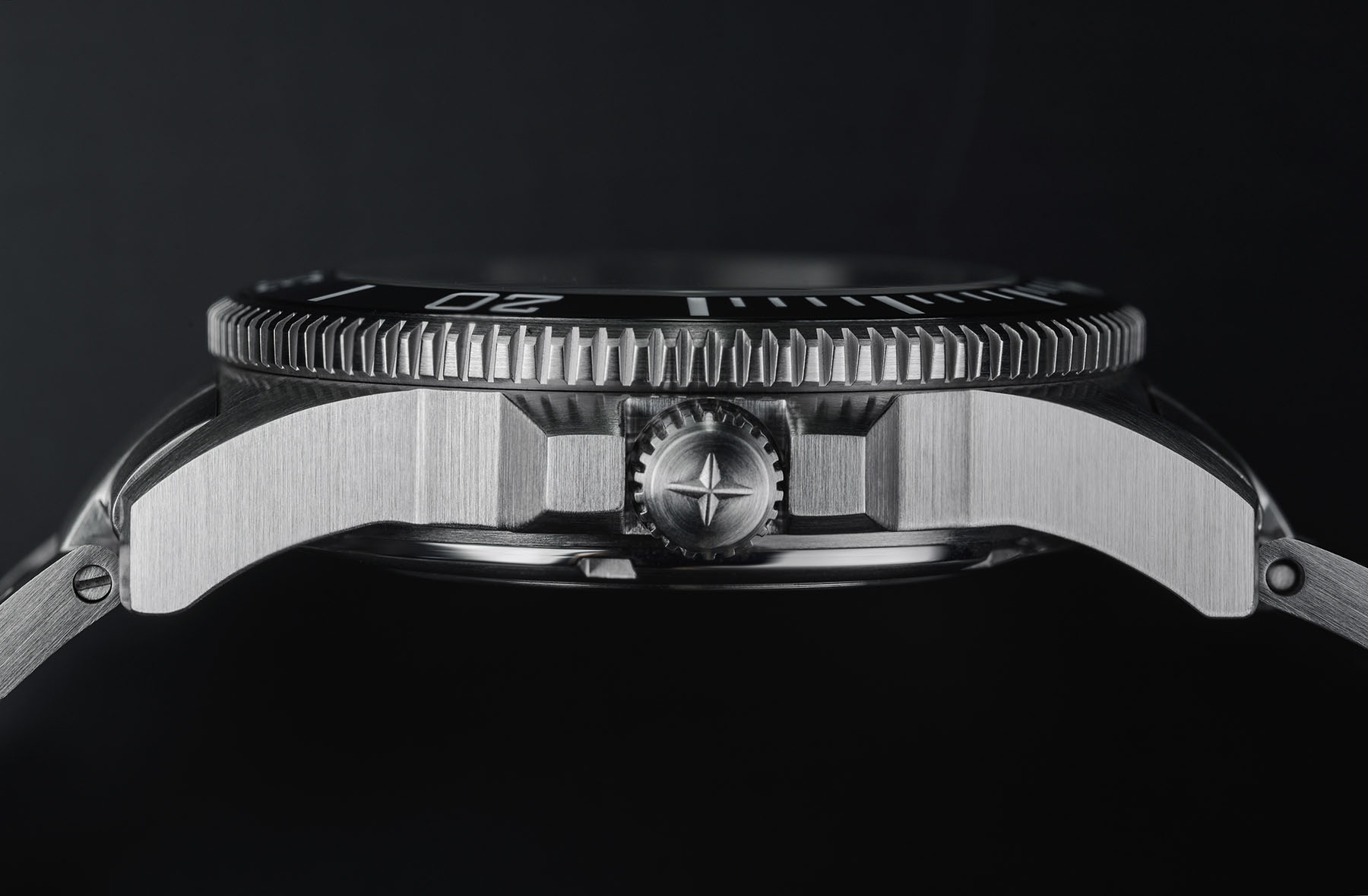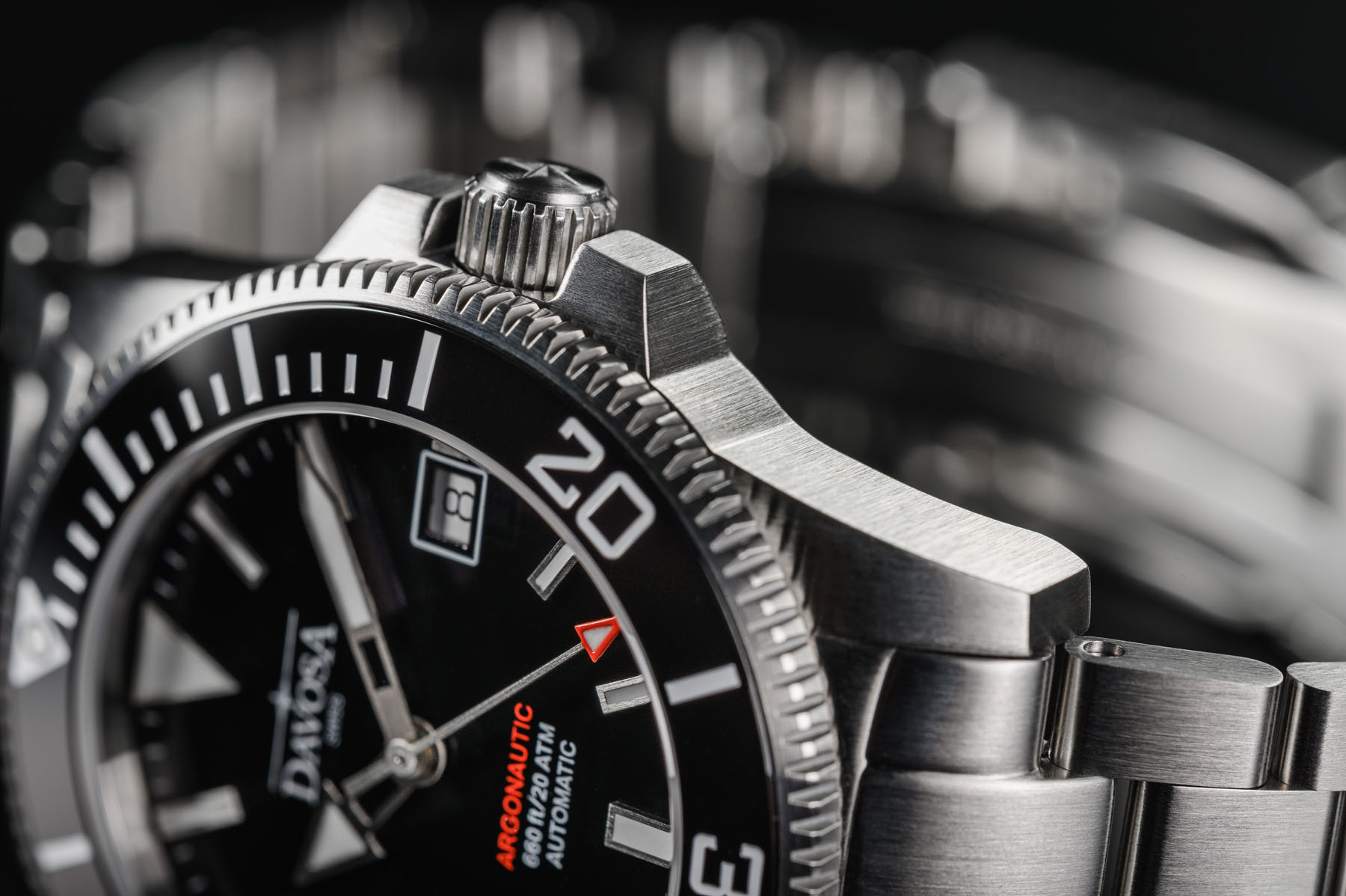 - Die Uhrenkrone zwichen den Kronenschutznocken auf der rechten Gehäuseseite ist geriffelt und die verschraubte Uhrenkrone besitzt ein erhabenes Davosa Logo