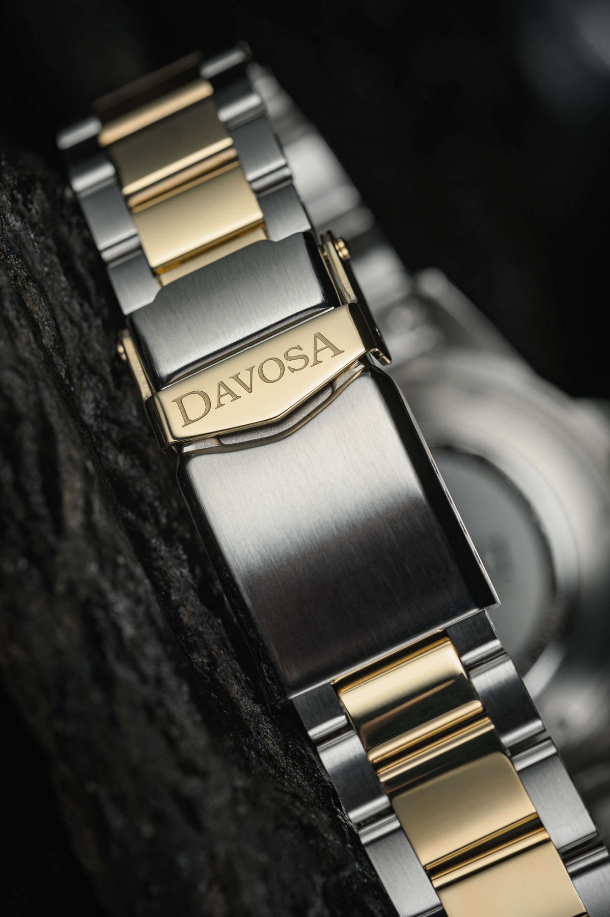 - Schließe: Satinierte 316L Edelstahl Faltschließe mit goldfarbenem Sicherheitsbügel und einem eingraviertem Davosa Logo