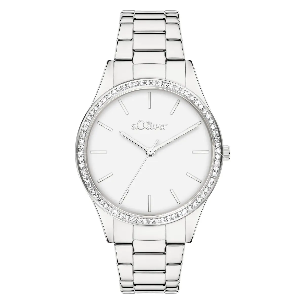 Erhalten Sie direkt hier bei uns diese moderne s.Oliver Damen Analoguhr mit weißem Zifferblatt und einem Durchmesser von 33,5