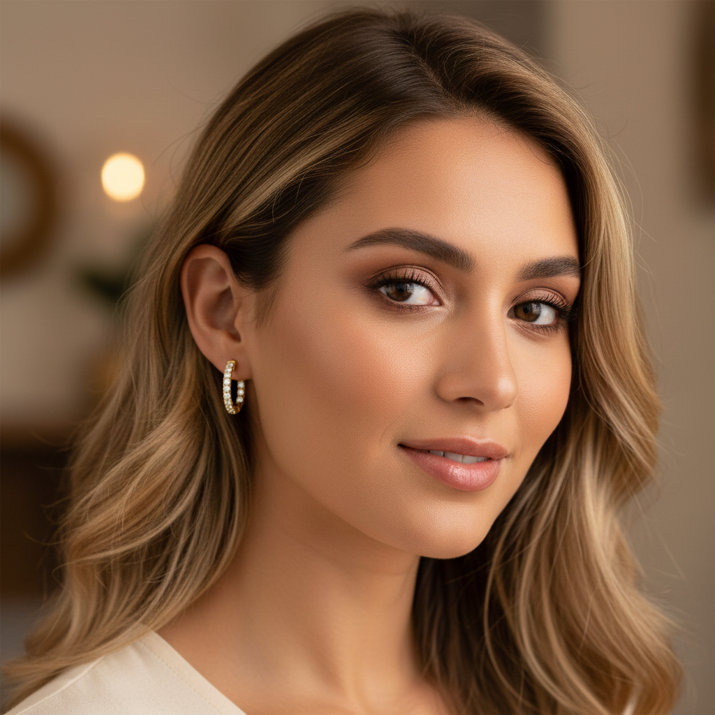 - Fassart: Die Diamanten mit Brillantschliff sind teils auf dem Außendurchmesser oder auf der Innenseite der Creolen gefasst