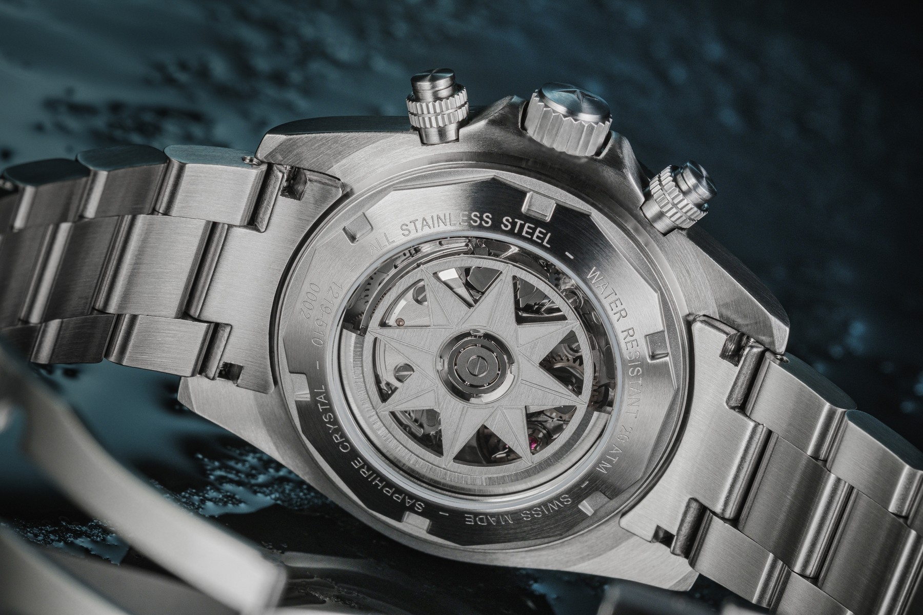 - Das präzise schweizer Chronographenwerk mit Finnisage (Uhrwerks Veredelungsprozess beinhaltet den sternförmigen skelletierten Rotor aus BEYOND STEEL in Windrosenform.