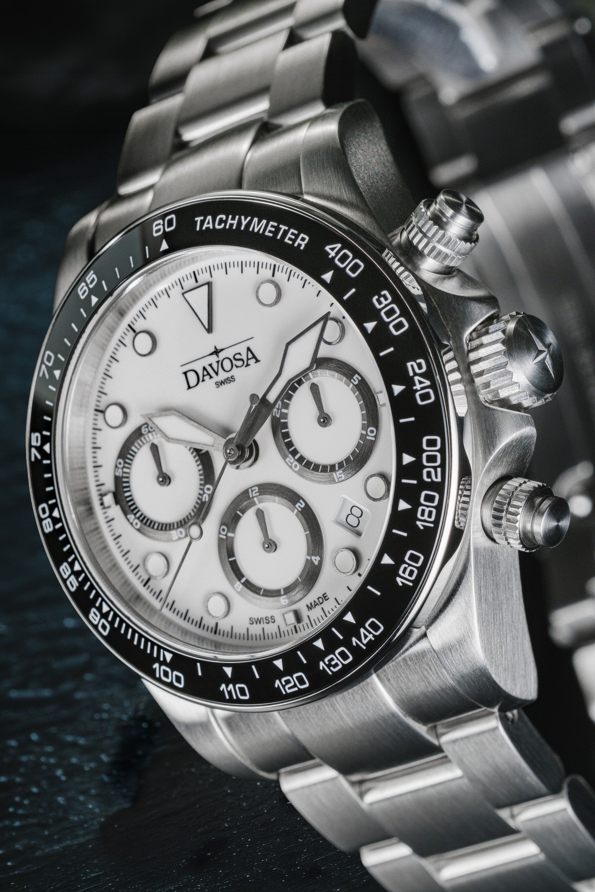 - Dieses Davosa SWISS LOGO prangt an diesem Ternos Professional Chrono auffällig und gut lesbar im oberen Drittel des Zifferblatt.