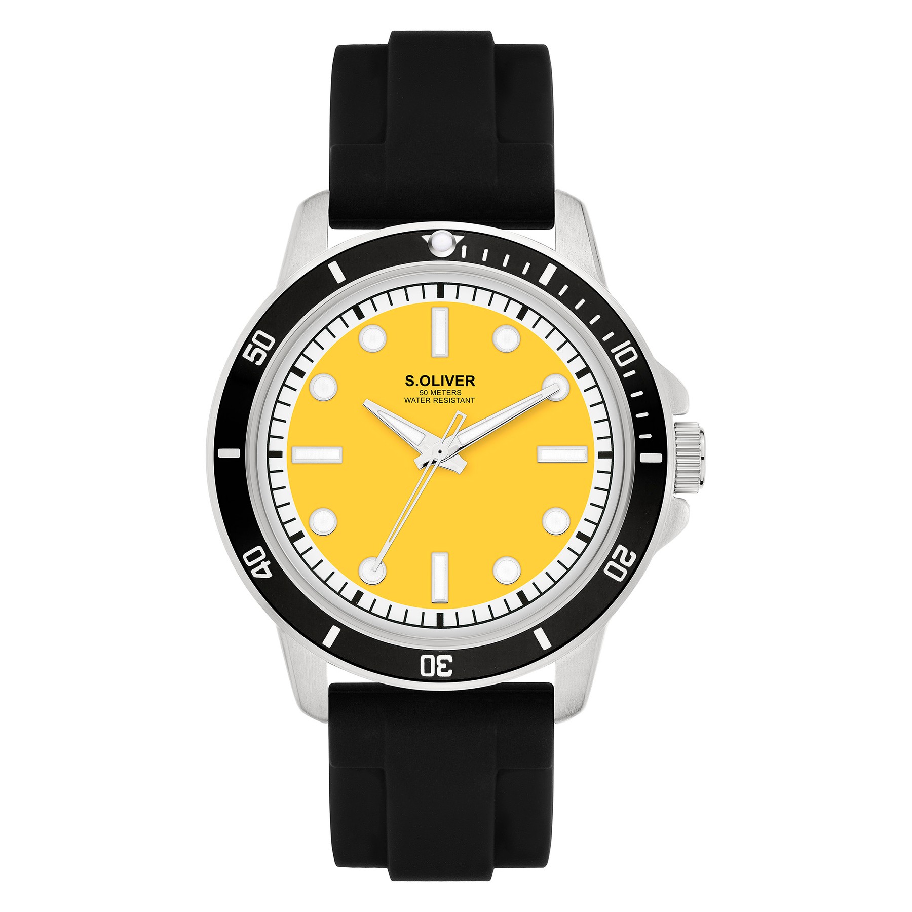 Erhalten Sie direkt hier bei uns diese moderne s.Oliver Herren Analoguhr mit gelbem Zifferblatt und einem Durchmesser von 42 mm
