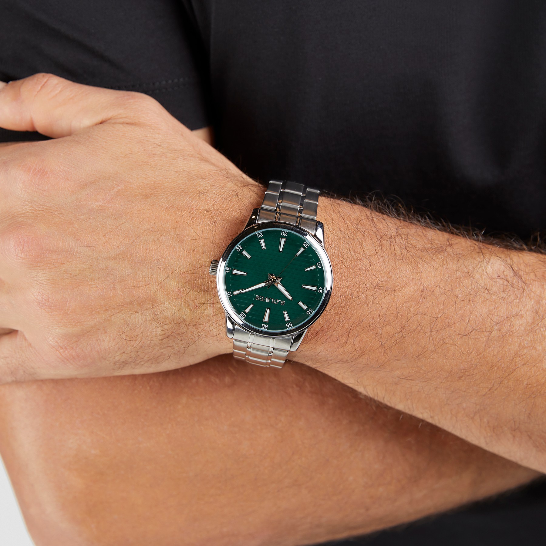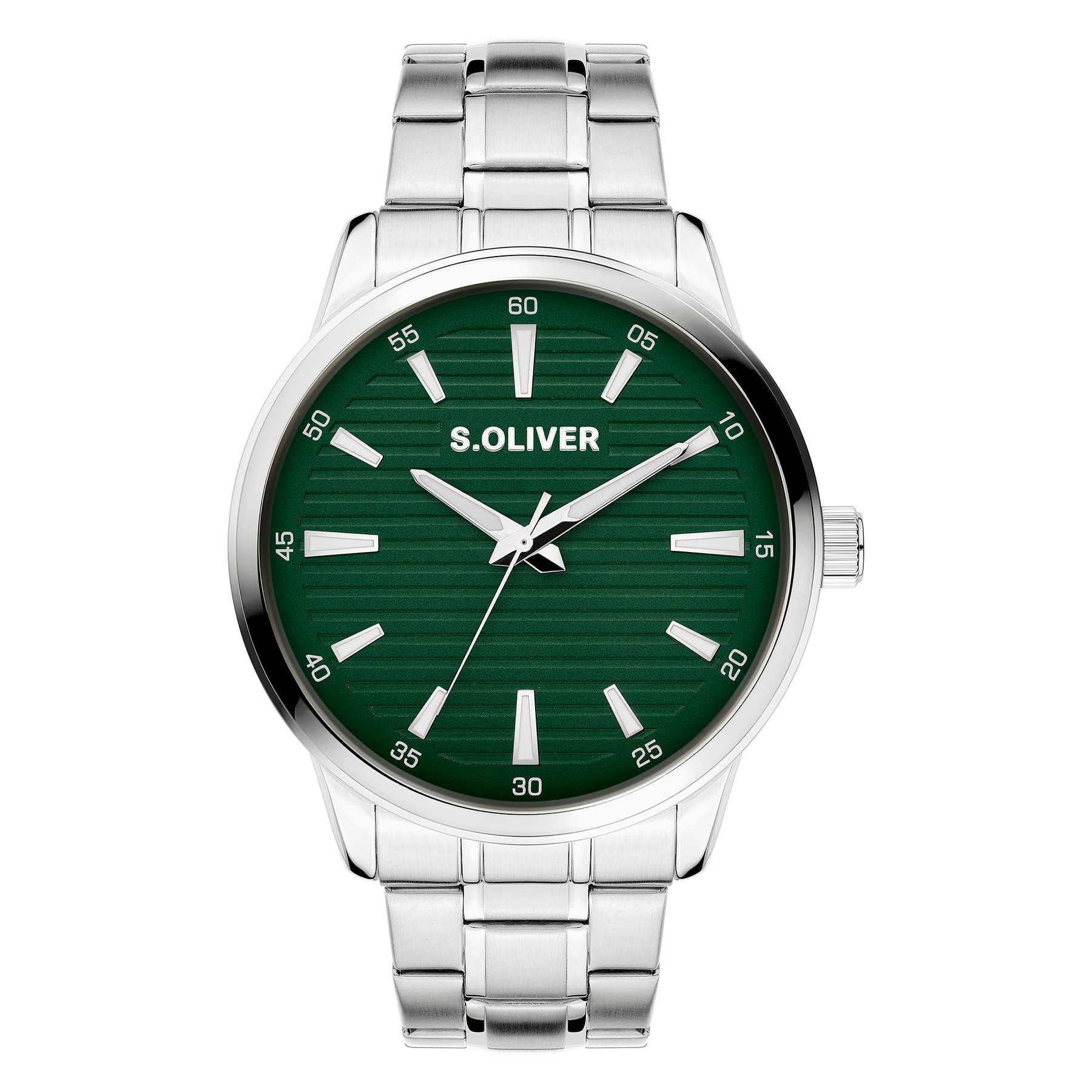 Erhalten Sie direkt hier bei uns diese moderne s.Oliver Herren Analoguhr mit grünem Zifferblatt und einem Durchmesser von 44,5 mm